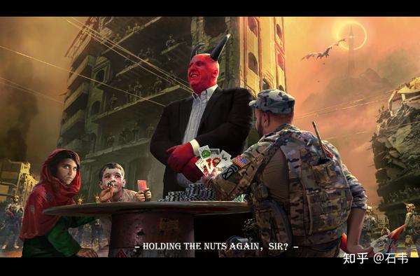画面主要角色虽然有四个人,但是本质上还是三方:作弊的美军,无辜的阿富汗,以及恶魔的庄家。